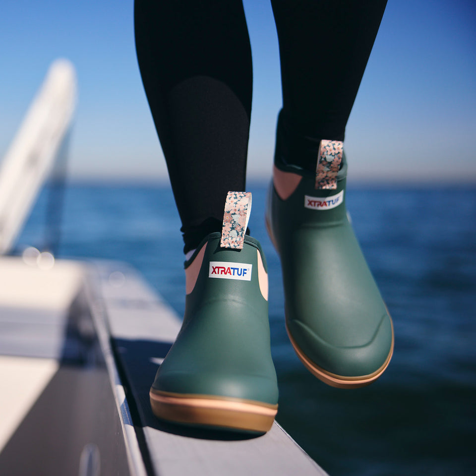 The Ankle Deck Boot collection has been crafted specifically for off-shore anglers. Anglers are athletes, and like any athlete they demand the best footwear to help them perform at a high level. We've created a lightweight design with the same slip-resistant Chevron outsole found on our Legacy boots. The 6" ankle deck boot is a great option for any on-the-water athlete looking for protection with slip-on-and-go styling. This boot is constructed with hand-laid rubber, and so not classified as a commercial grade boot. For those looking for a commercial grade ankle height deck boot please search for the Wheelhouse Boot. This style also features new seasonal floral print pull tabs.