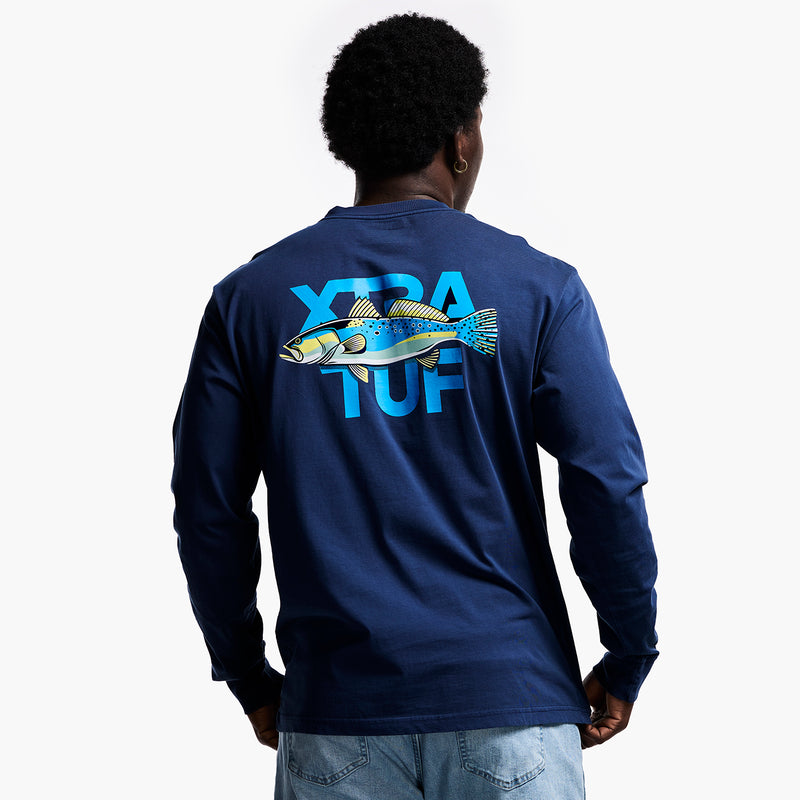 Person wearing a long-sleeve shirt with 'Xtra Tuff' branding and a fish graphic on the back.