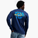 Person wearing a long-sleeve shirt with 'Xtra Tuff' branding and a fish graphic on the back. Person wearing a long-sleeve shirt with Xtra Tuf logo and fish graphic on the back.