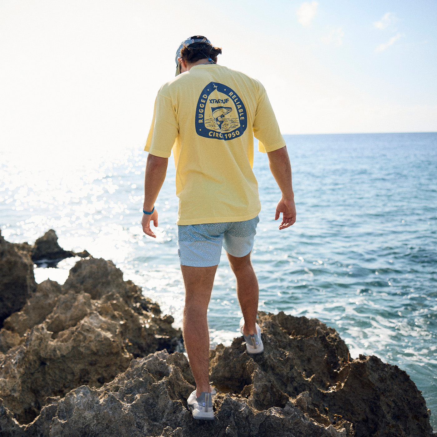 The Xtratuf short sleeve tee comes in a Pale Banana color and features a Xtratuf Salmon logo on the left side of the chest and a graphic on the back. Available in sizes S-XXXL.