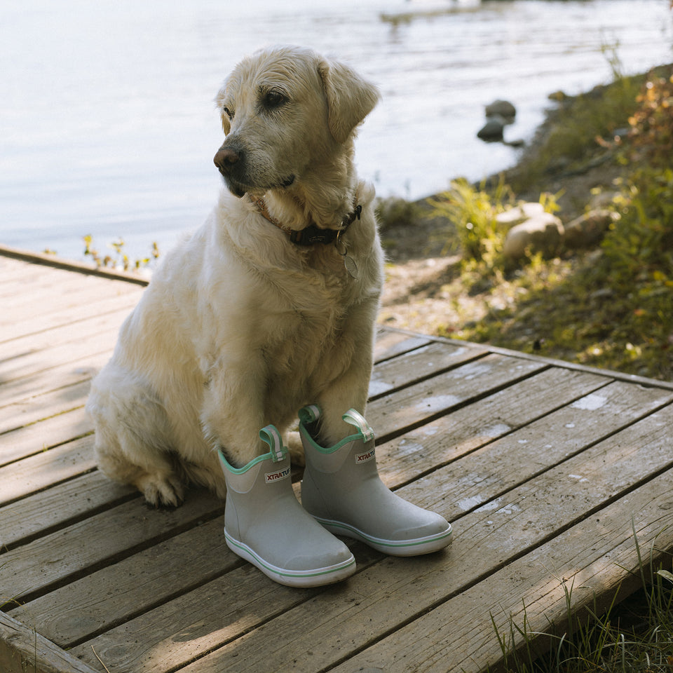 The Ankle Deck Boot collection has been crafted specifically for Off-Shore anglers. Anglers are athletes, and like any athlete they need the best footwear to help them perform at a high level. We've created a lightweight design with the same slip-resistant Chevron outsole found in our Legacy boots. The performance ankle deck boot is the perfect boot for any on the water athlete looking for protection with slip-on-and-go styling. This Light Gray boot features a complementary seafoam detail at the sole, pull-tabs and top lining for added style.