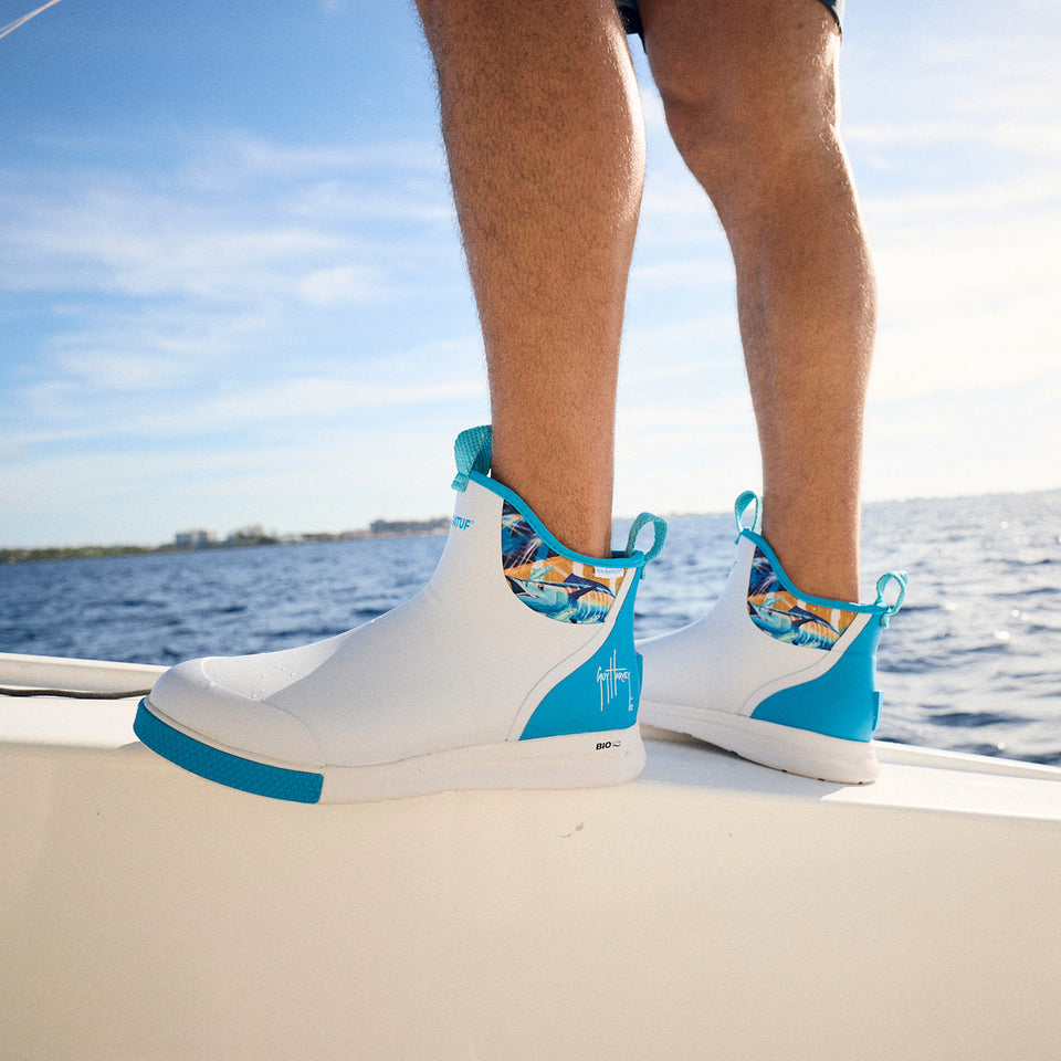 The Ankle Deck Boot collection has been crafted specifically for off-shore anglers. Anglers are athletes, and like any athlete they demand the best footwear to help them perform at a high level. The Guy Harvey collection has the same great benefits and features signature blue pull tabs and Guy Harvey's signature Wahoo print.